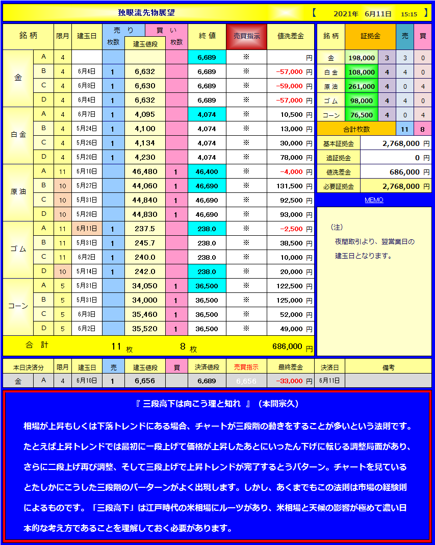 6月11日(金)本日の売買とポジション | 独眼流先物展望 本日の変動データ | 独眼流先物展望 本日の変動データ