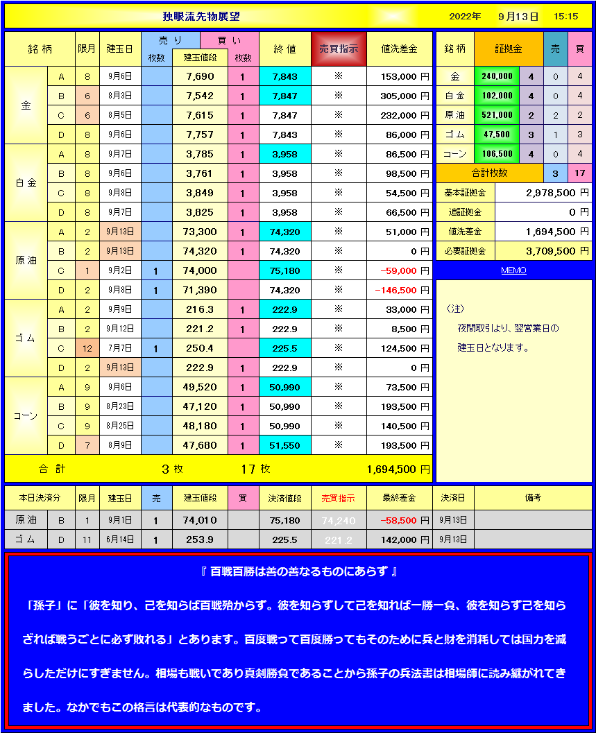 9月14日(水)本日の売買とポジション