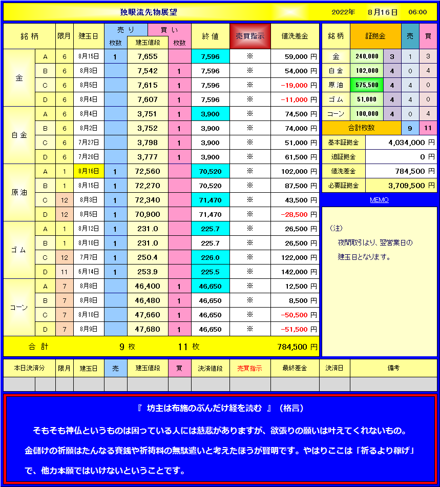 8月16日(火)本日の売買とポジション