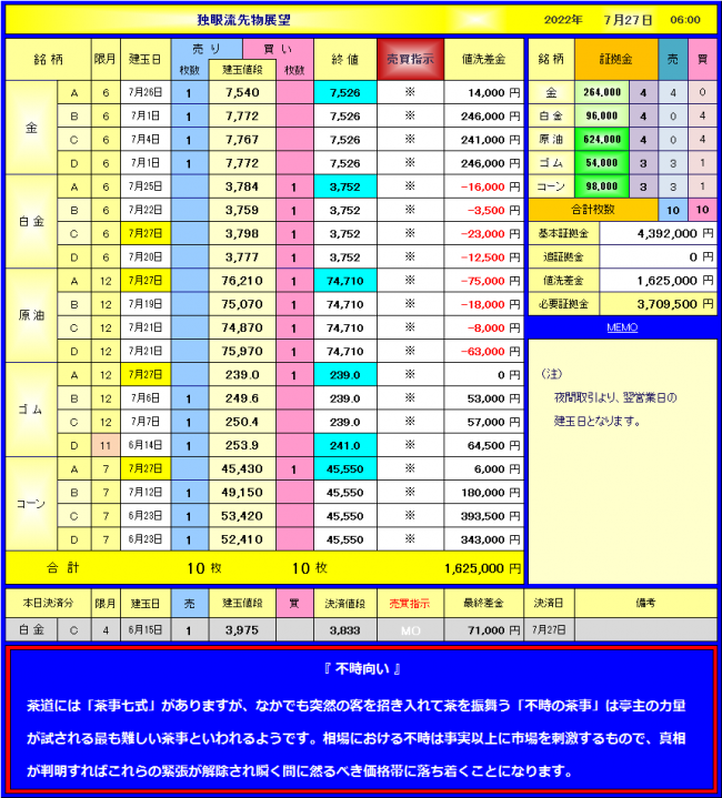 7月27日(水)本日の売買とポジション