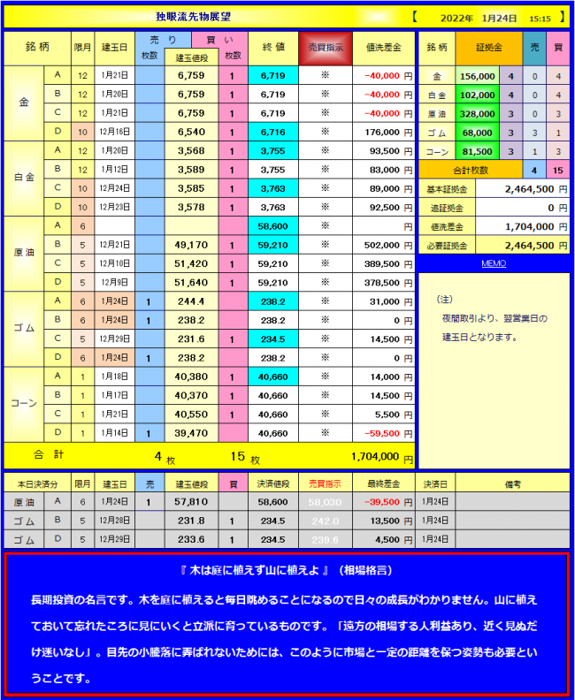 1月24日(月)本日の売買とポジション